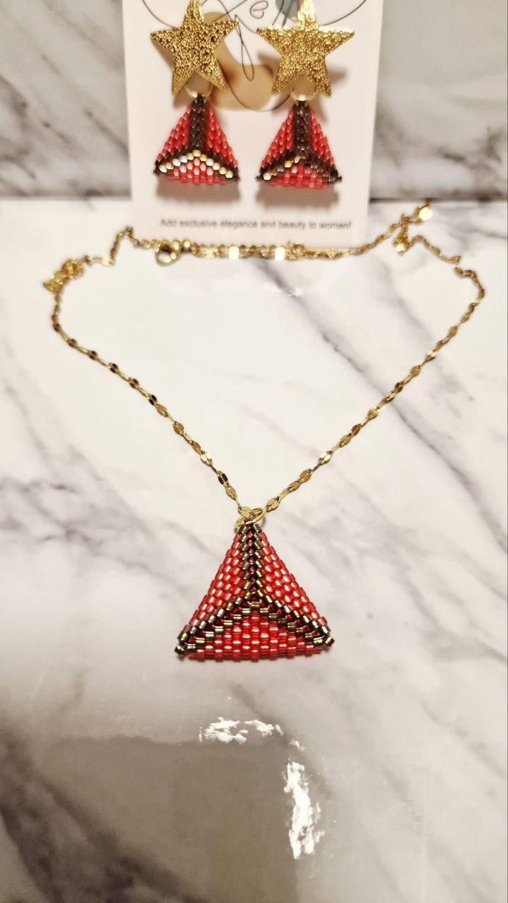 Colgante Miyuki XL: Dije en forma de pirámide plana tejido minuciosamente con cuentas Miyuki en color rojo intenso y bordes en bronce metálico, aportando una textura geométrica única.