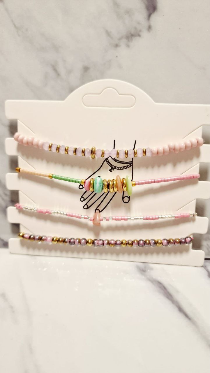 Este conjunto destaca por su mezcla ecléctica y juguetona de colores. Diseñado para quienes aman los accesorios con personalidad, cada pulsera aporta un elemento visual distinto, desde cuentas de cristal facetado hasta piezas circulares de resina en tonos pastel que crean un relieve único en la muñeca.