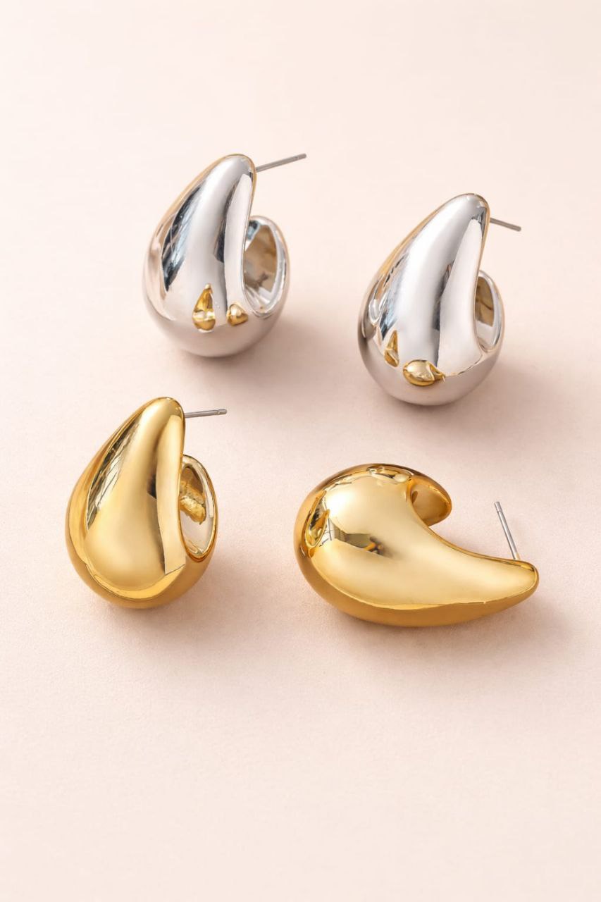 Eleva cualquier atuendo con estos pendientes que parecen metal fundido en movimiento. Su diseño de gota gruesa captura la luz desde todos los ángulos gracias a su acabado pulido de alta intensidad, convirtiéndolos en la pieza perfecta para quienes buscan un accesorio contemporáneo y con mucha personalidad.