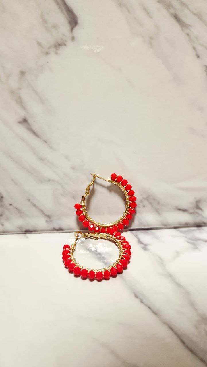 Añade un punto de luz y carácter a tu estilo con esta variante de nuestros aros artesanales. Confeccionados meticulosamente, el revestimiento de cristales rojos sobre la base dorada crea un contraste clásico y elegante que no pasa desapercibido.