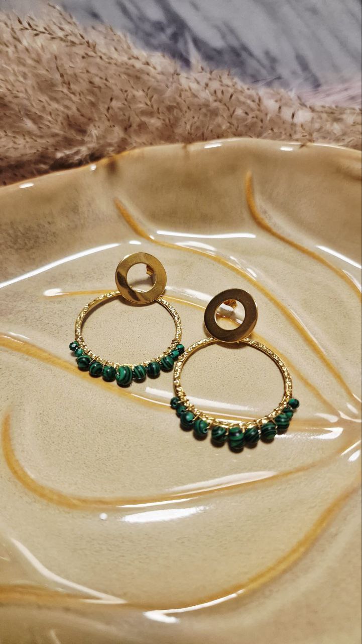 Añade un toque de distinción orgánica a tu colección con estos pendientes de diseño mixto. Elaborados meticulosamente a mano, destacan por la combinación de texturas metálicas y la profundidad del verde veteado de las piedras naturales, creando un accesorio que equilibra la modernidad con la artesanía tradicional.