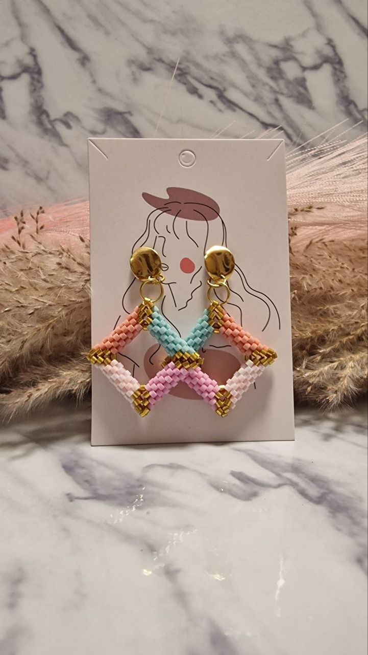 Delicados pendientes de diseño geométrico en forma de rombo, tejidos a mano con mostacillas en una suave paleta de rosa, menta y melocotón. Una pieza artesanal ligera y llena de color.