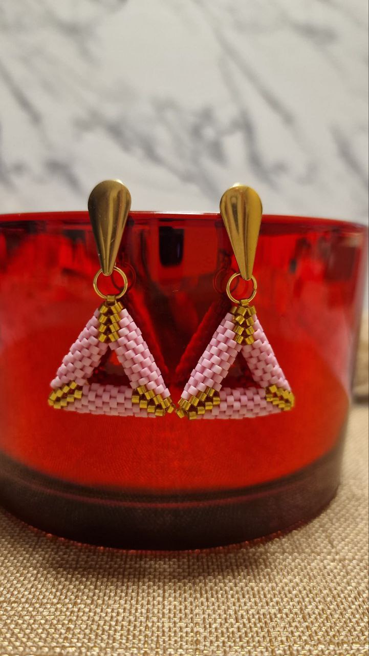 Delicados pendientes triangulares tejidos a mano con mostacillas en color rosa pastel y detalles en oro. Un accesorio geométrico femenino con cierres de acero inoxidable de alta calidad.